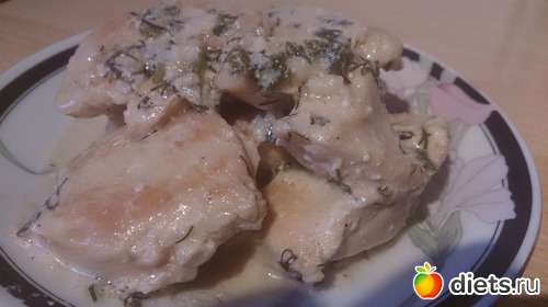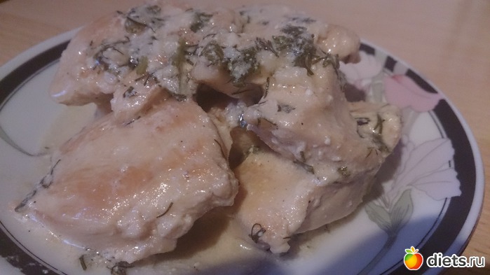 Ужин: тушеное куриное филе со сметаной и чесноком.