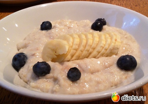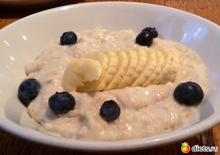Завтрак на выходе: грейпфрутовый фреш, овсянка с фруктами и кофе.