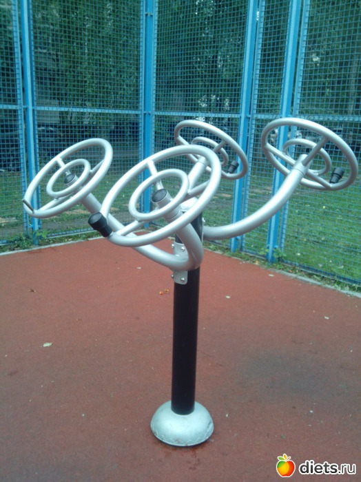 Руками берешь две черные ручки на колесах, на фотке спереди одна сломана отходишь от тренажера примерно на метр, корпус чуть наклоняешь вперед и получается что у тебя руки на эти круги почти ложатся, и ты начинаешь интенсивно их крутить в одну сторону одновременно или вразнобой руки тренировать, у меня после него руки так ощутимо подрагивали