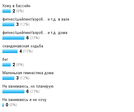 Я уже не обращаю внимания, занимаемся на заброшенном стадионе, с братом, 3 раза в неделю, вечером правда, 8 кругов интервального бега плюс с полчаса упражнений, приседания, наклоны, растяжка. Дома занимаюсь с Джаннет Дженкинс (Голивудский тренер), пресс, и "Я хочу такое тело" с Темилли Уэб. Вчера попробовала боди балет Ballet Fitness by Jennee - Ballet Blast , понравилось. Хочу включить его в тренировки хоть раз в неделю.