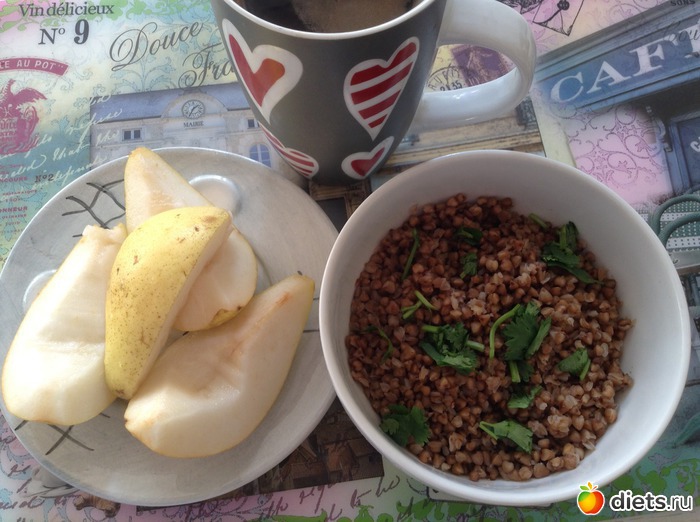 Завтрак - гречневая каша, груша, кофе: