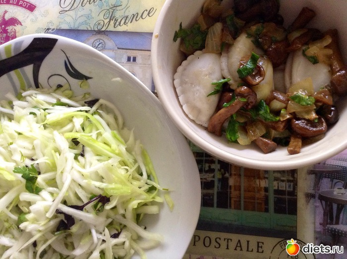 Обед - вареники с картошкой и грибами в грибном соусе и салат из капусты с уксусом: