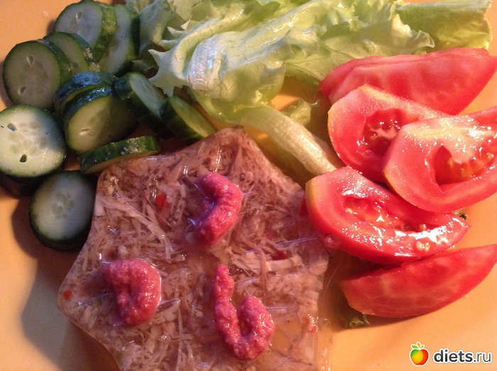 Ужин - низкокалорийный студень, огурец, помидор, пара листьев салата: