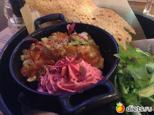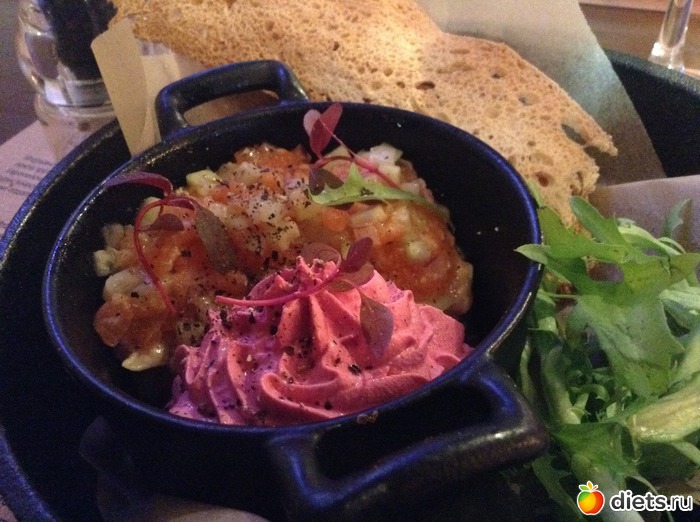 Выглядит порция большей, чем есть на самом деле: вместе это 150 г. И в тартаре не только лосось, но и огурчик. А чизкейк на самом деле это творожный крем со свекольным соком и специями. Но очень вкусно! И я наелась совершенно