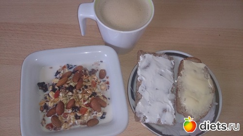 Завтрак: гранола моя с молоком, миндаль, кусочек хлеба серого с маслом сливочным (ужасно захотелось), хлебец с сырной массой, кофе с молоком и сз