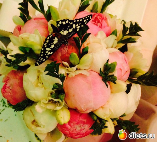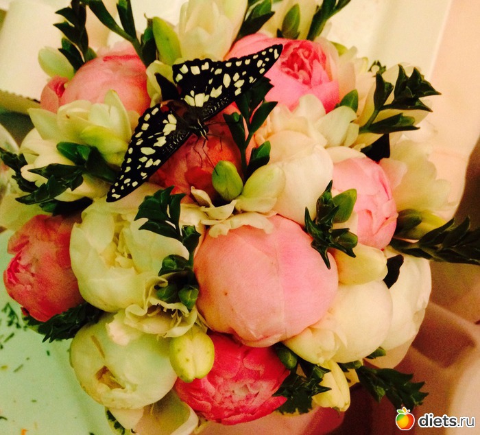 Бабочка на букете живая, они по рексторану летали и одна прилетела ко мне на букет, всю ночь на нем просидела, а утром я ее на улицу выпустила: