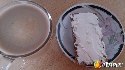 Завтрак: мои мюсли с молоком и добавила еще немного дробленого миндаля, кофе с молоком и хлебец с рикоттой