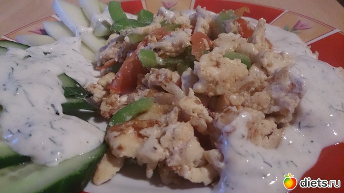 На ужин яйцо и 3 белка с перцем, помидоркой, огурчик, кольраби и что-то вроде йогуртового соуса с зеленью.