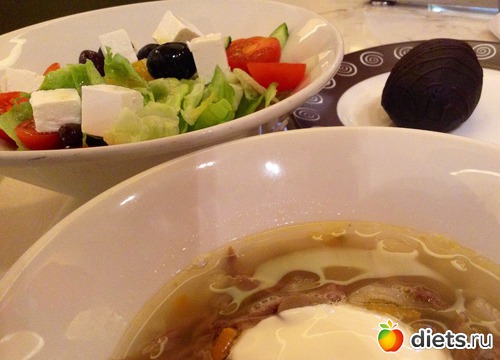 Обед - щи старорусские, греческий салат (с половиной порции соуса) и