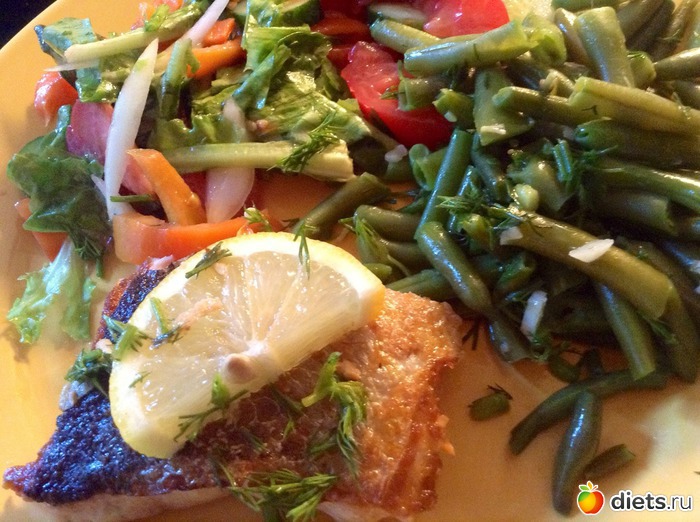 На гарнир - зеленая фасоль с чесночком и зеленью и салат с помидорами, огурцами и перцем.
