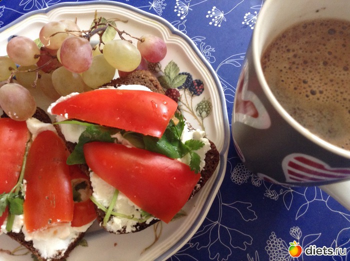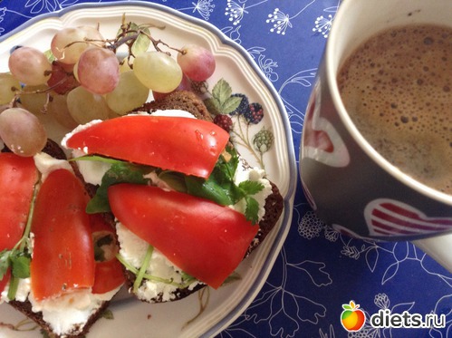 Завтрак - захотелось сделать любимый бутерброд: бородинский хлеб, творог, красный сладкий перчик. Еще кофе и виноград.
