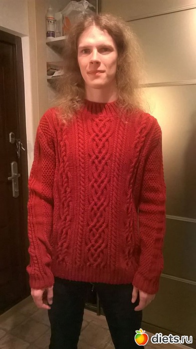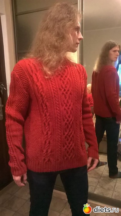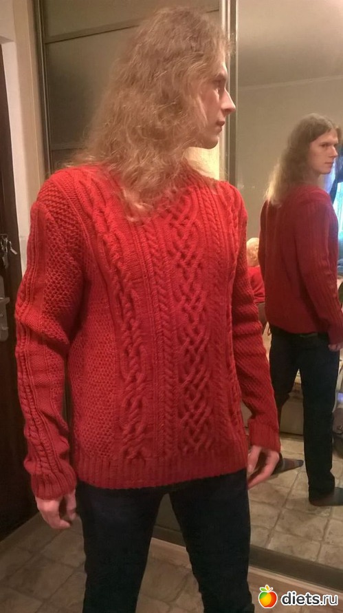 Кстати, я тоже свитер мужу начала вязать аранами, центральный узор точь-в-точь, как у тебя. Только вот времени нет пока, два рукава остались в недовязах, а уже зима на носу....