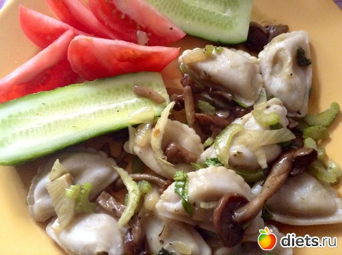 Обедала дома, сварила нам с мужем "избенкиных" вареничков с картошкой и грибами, сделала к ним соус из опят, добавила огурчик и помидорчик, ну и чуток щавелевого супа осталось.