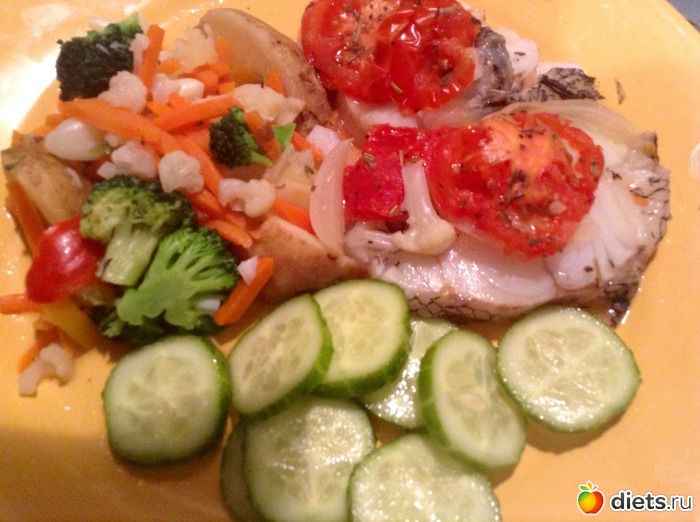 На ужин приплыл из микроволновки макрорус на подушке из овощной замороженной смеси (молодая картошка, брокколи, цветная капуста, морковь), ему компанию составил огурец.