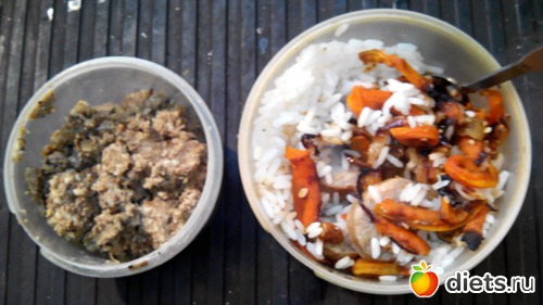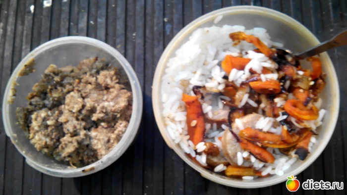 Вот тут как раз появляется нечто новое. В большой банке рис, перемешанный с запеченными овощами и куриной колбаской из тех, что делают на гриле.