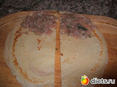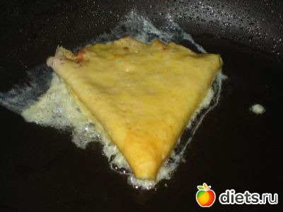 Интересует рецепт блинчиков с мясом, фарш сырой, блинчик треугольником сворачивается и еще как-то в кляре обжаривается.
