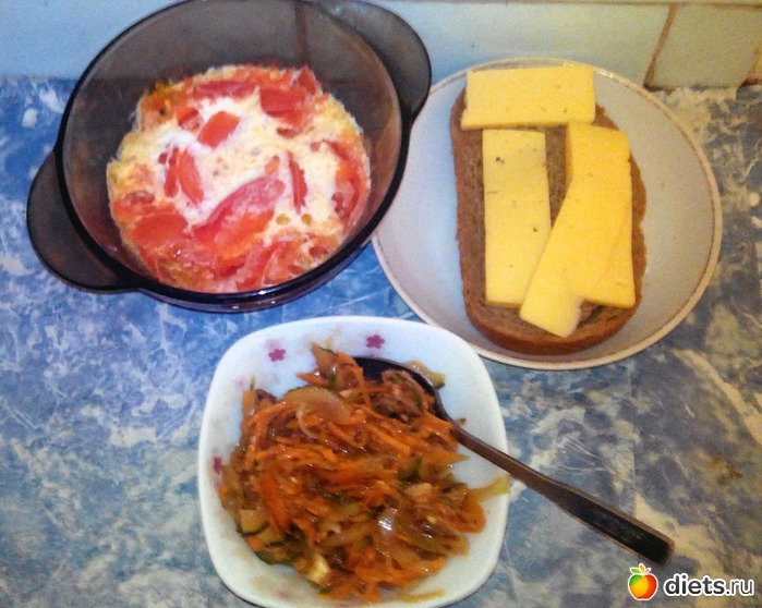 Что-то вроде омлета из одного яйца и помидорки, приготовленный в микроволновке. Чуточку того салата, что делал на днях. Он, кстати, получился довольно концентрированным, так что будет лучше его ем-то разбавлять. Ну, и кусочек хлеба с сыром.