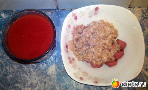 Томатный сок, овсянка и сосиска. В которой 50 грамм веса и 150 килокалорий.