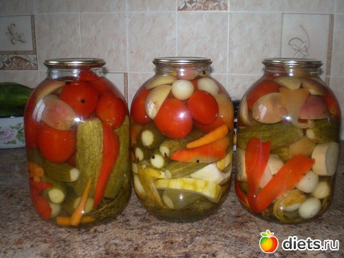 Огурчики с помидорчиками закрыты вместе со свеклой, поэтому такой цвет у маринада.