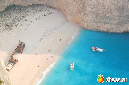 На греческом острове Закинф находится один из самых прекрасных пляжей в мире. Когда-то здесь потерпело крушение судно Панайотис, которое принадлежало контрабандистам. Корабль так и покоится до сих пор в белопесчаных дюнах.