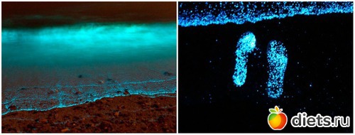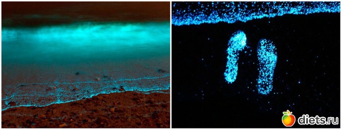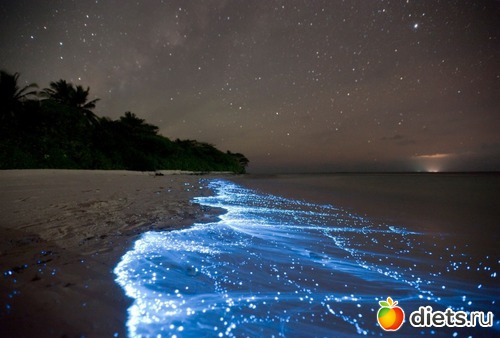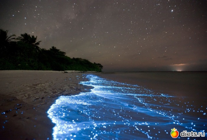 Есть в мире один пляж, который особенно красив ночью. Планктон выброшенный на пляж острова Ваадху окрашивает берега тысячами огней. Свечение объясняется биолюминесценцией — химическими процессами в организме животных, при которых освобождающаяся энергия выделяется в форме света. Голубые светящиеся волны словно отражают звезды в небе над Мальдивами!