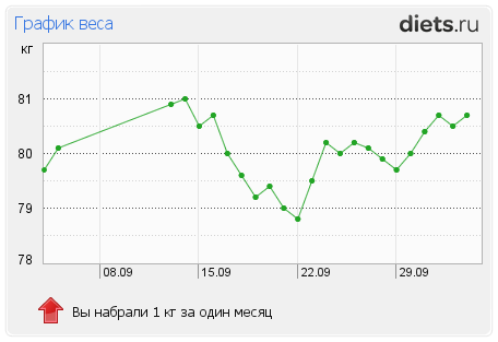 Пока считала калории и отчитывалась ежедневно здесь вес уходил, медленно но верно. Потом я решила, что смогу правильно питаться и без жесткого подсчета... Сначала все шло хорошо, потом дала маленькую слабинку, а теперь фактически вернулась к своему старому питанию... Вес скачет в пределах от 79 до 81. Вот мой график за последний месяц.