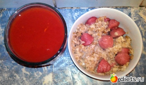 Томатный сок, овсянка и случайно обнаруженная, забытая всеми сосиска.
