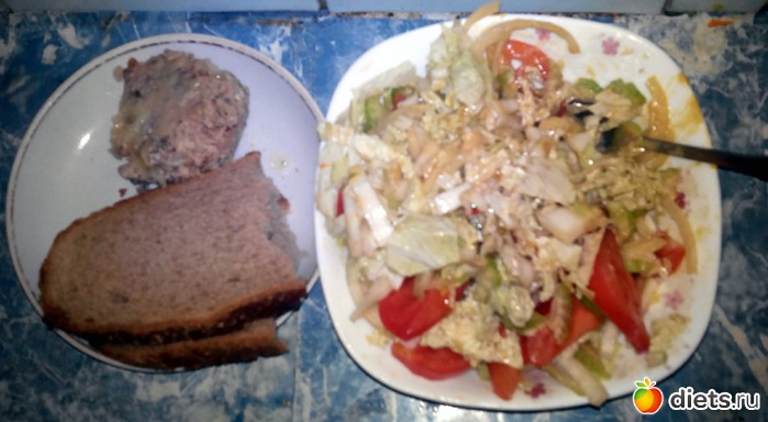 Салат из пекинки, чуточки лука и сельдерея и помидорки. Заправил соевым соусом, яблочным уксусом, горчицей и чайной ложкой растительного масла. Кусочек хлеба и обнаруженная в холодильнике котлета из куриного фарша.