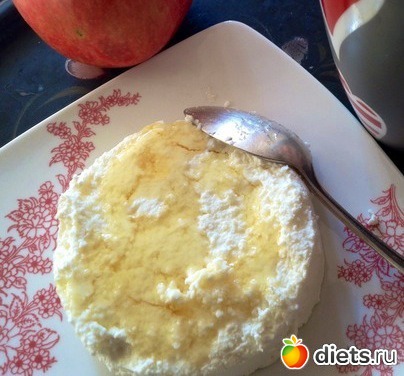 Завтрак - творог с ложечкой меда, персик, кофе.