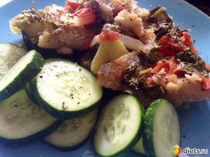 Обед - суп-пюре из зеленой фасоли (без хлеба, просто фото прежнее) и минтай с соте из баклажанов и огурцом.