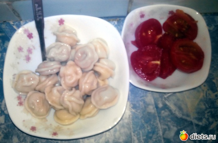 Ай-ай-ай!!! Это пельмени!!! И соленые помидорки.