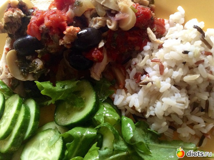 курица по-сицилийски со смесью "4 риса" и огурцом, чай.