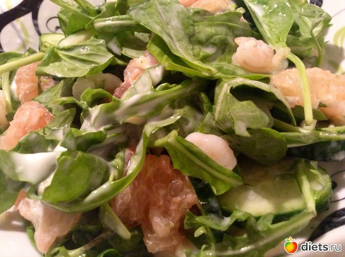Ужин - мой любимый салат из листьев шпината с креветками, грейпфрутом и огурцом, заправленный йогуртом.