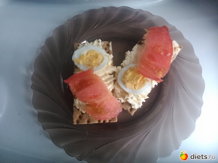 Завтрак - совсем не хотелось каши с утра, поэтому сделала два бутерброда из хлебцов с яйцом, смешанным с творожным сыром и чесноком.. с небольшим ломтиком помидора...