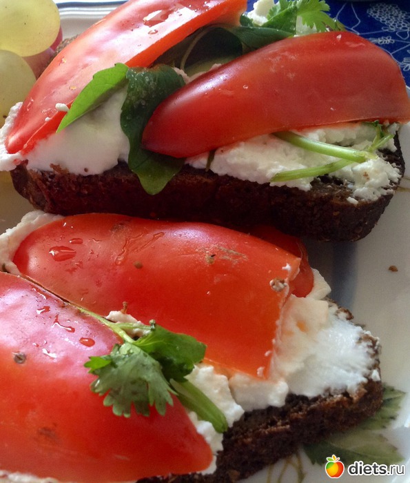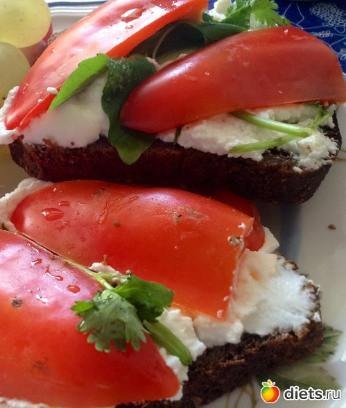 Завтрак - черный хлеб с творожным сыром и сладким перцем, немного сока, кофе