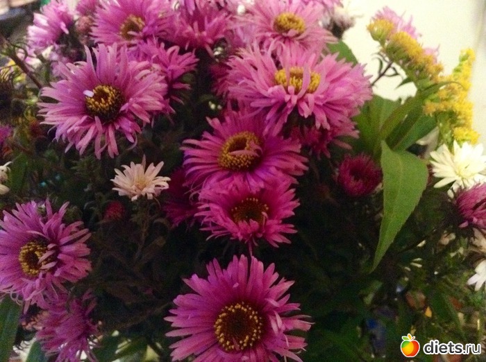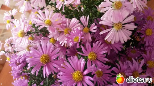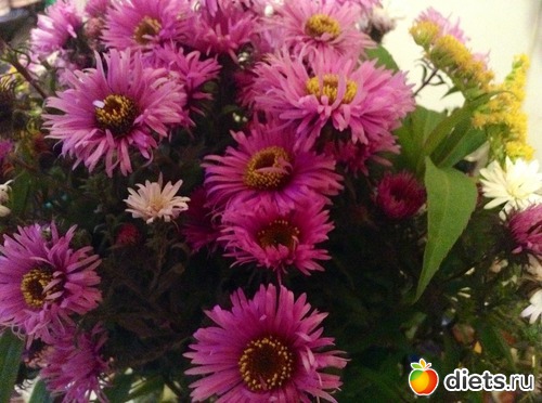 муж принес мне цветы. (Я и не знала, что эти кустовые осенние астры называются "Анна Австрийская".)