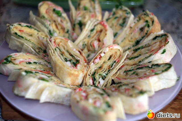 Развернуть лаваш (тонкий), положить на него начинку и свернуть рулетиками или конвертиками. Дать пропитаться 30 минут.