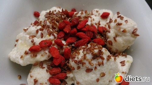 Завтрак: ленивые варенички с отрубями и овсяной мукой (теперь буду так чаще делать, были очень вкусные) с медом, льняными семенами, последними ягодками годжи, кофе с молоком