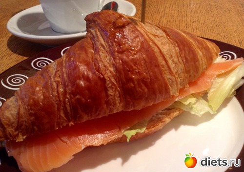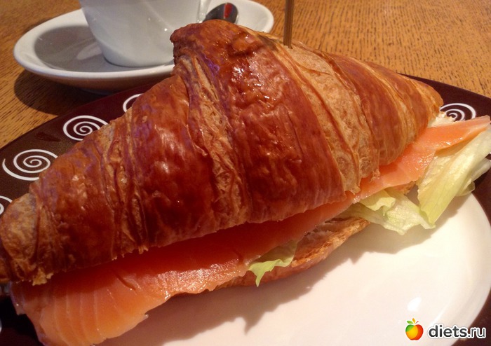Завтрак - круассан с семгой, морковный фреш, кофе (с пенкой