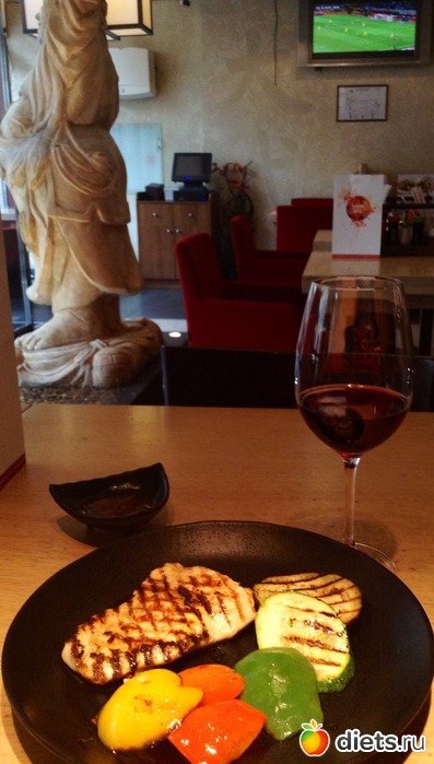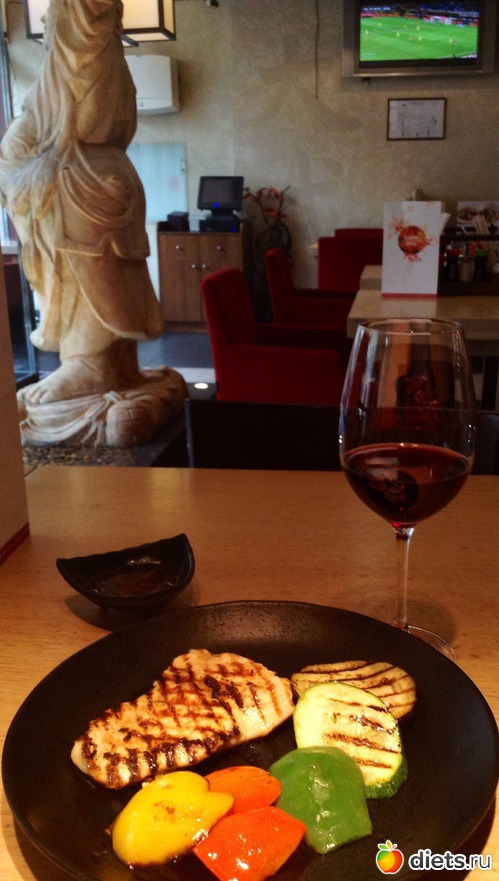 в бокале кьянти. А к нему была куриная грудка и овощи с гриля ("