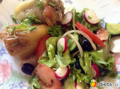 поздний обед - в компании с любимым мужем. На моей тарелке оказались перчики с мясом и рисом и салат: