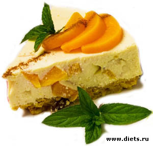 6. Теплый «стабилизатор» вливаем в начинку. Все хорошенько перемешиваем. Затем выкладываем получившуюся массу на кукурузно-шоколадную основу, разравниваем влажной ложкой и ставим наш готовый чизкейк в холодильник на 3 – 4 часа. Перед подачей украсьте ваш десерт дольками абрикосов или персиков и листиками мяты. Приятного вам аппетита. Это очень вкусно, попробуйте сами!))