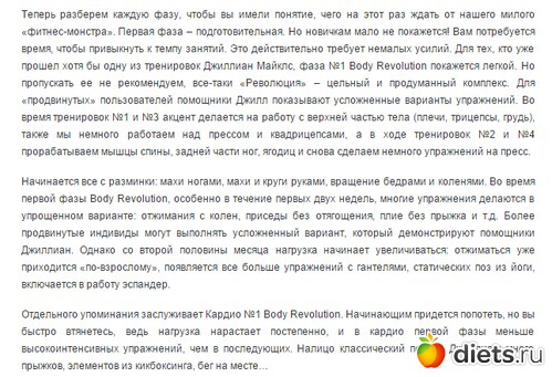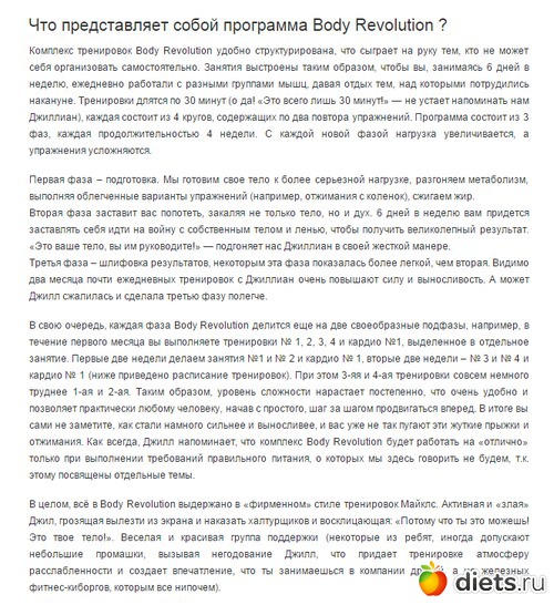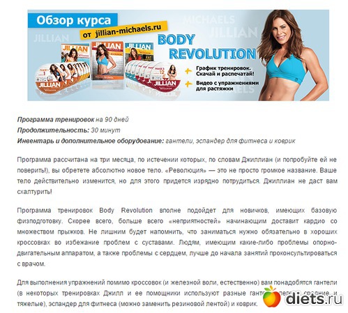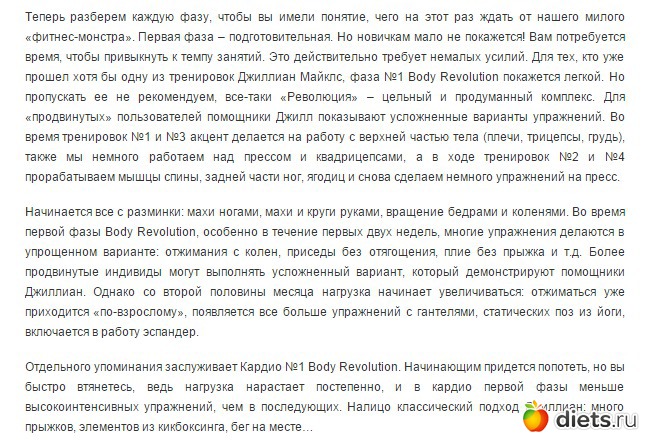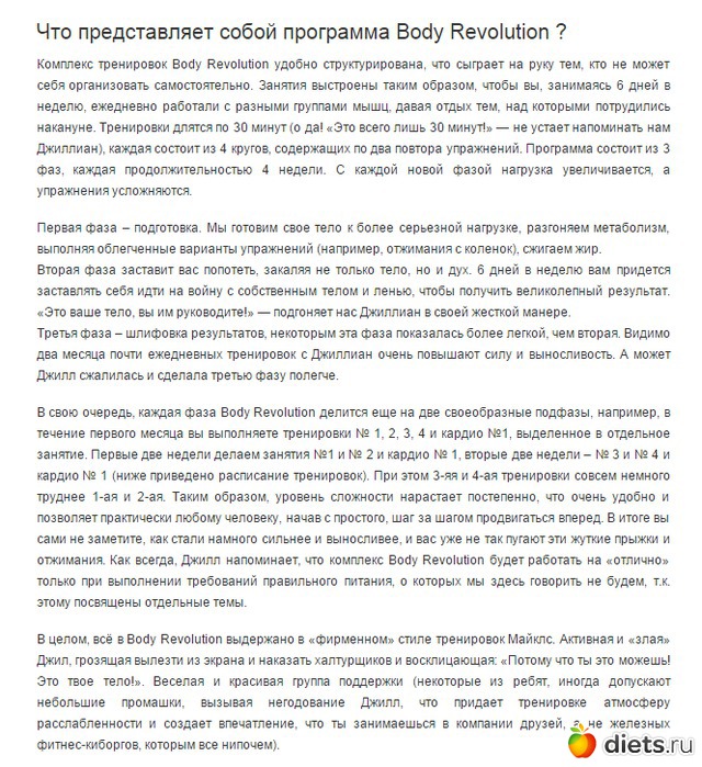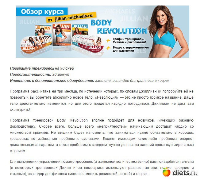 программа Джиллиан Майклз "Body Revolution" рассчитана на 90 дней. Она состоит из 3 фаз. В первой фазе вы начинаете разгонять свой метаболизм и сжигать жир. Во второй фазе вас ждут более трудные упражнения, рассчитанные на то, чтобы полностью изменить ваше тело. Третья фаза нужна для того, чтобы закрепить ваш успех и довести свое тело до желаемой формы.