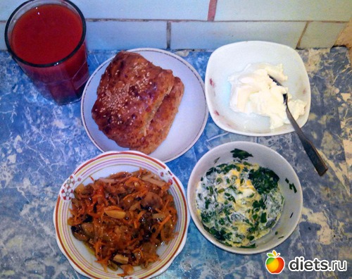 Сок, лепешка, греческий йогурт, яйцо и овощной салат.