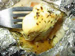 2. Готовую рыбу уложите на смазанную маслом сковороду, вокруг рыбы разместите кабачки, посолите, залейте все сметаной, разровняйте поверхность, посыпьте тертым сыром и запеките в духовке.