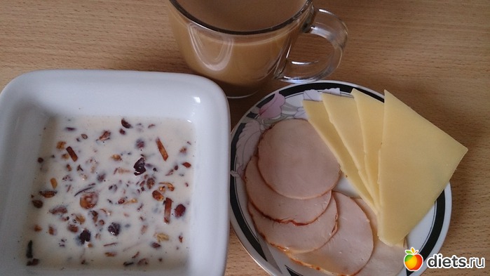 Завтрак: мои мюсли с орехами и медом на молоке, куриная колбаса и сыр 16%, кофе с молоком без сахара
