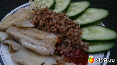 Обед: залитая с вечера гречка, рыбка поджаренная, огурец, немного кетчупа чили