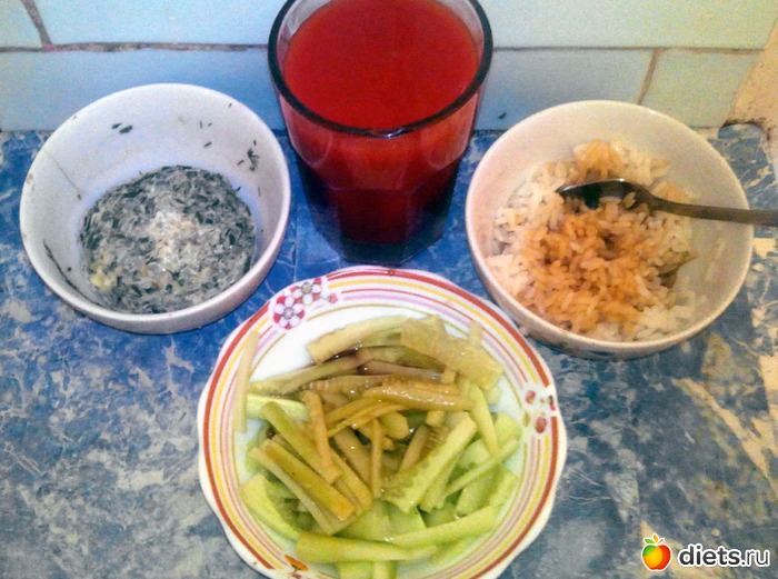 Сок, рис, яйцо с зеленью и огурец, нарезанный брусочками.