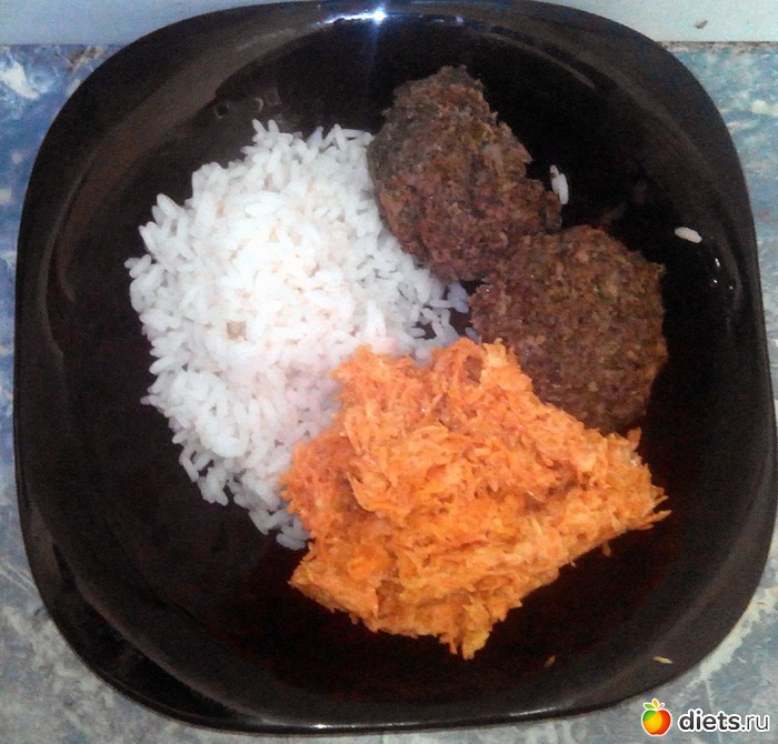 Еще порция риса, вчерашние котлетки и морковь с чесноком.