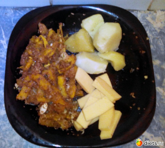 Тыква, чуть-чуть картошки и сыр. В тыкву, после запекания, я добавил тертого чеснока и немного бальзамического уксуса.